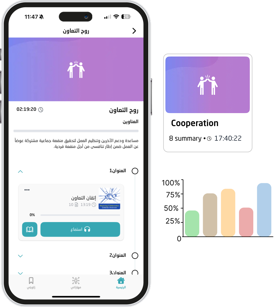 موسوعة صوتية متجددة تضم المهارات الأكثر طلبًا في سوق العمل، مع حرية مطلقة للموظف للاختيار ما يناسب تطوره المهني